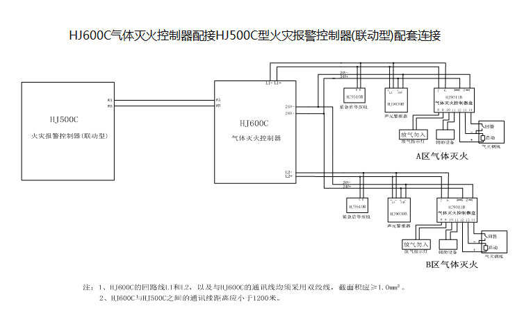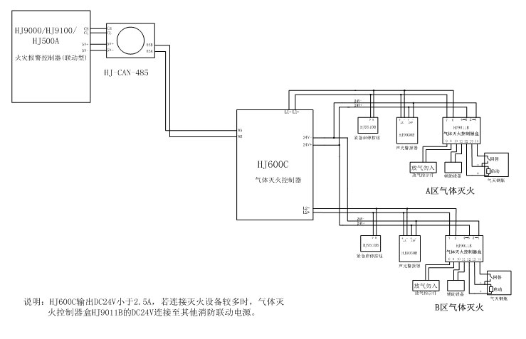 HJ600C氣體滅火控制器配接HJ500A、HJ9000或HJ9100型火災(zāi)報(bào)警控制器(聯(lián)動(dòng)型)配套配套連接: