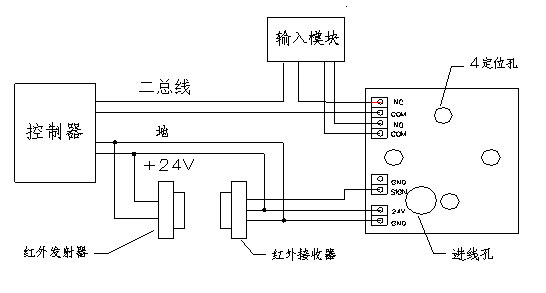 * COM、NO為無源常開觸點(diǎn),報警時閉合,為輸入模塊輸入開關(guān)信號。 * COM、NC為常閉觸點(diǎn),報故障時斷開。 * SIGN為紅外接收器信號線接線端。
