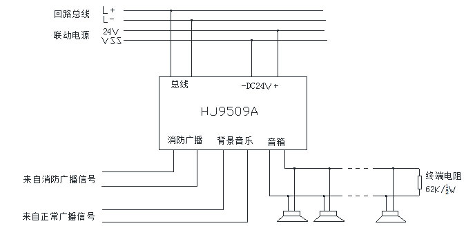 HJ9509A型輸出模塊專用于現(xiàn)場廣播音箱在背景音樂信號和應急消防廣播信號之間的相互切換,編址后可直接接入控制器回路,并參與消防聯(lián)動控制。