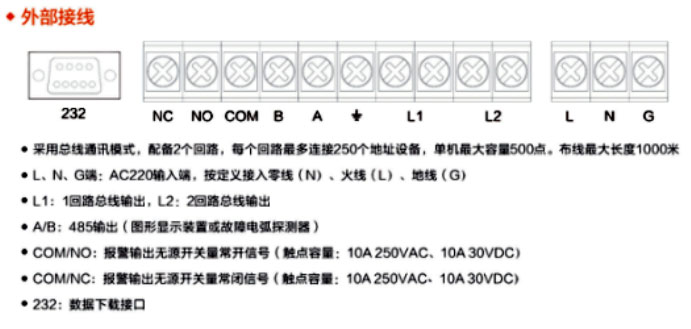 • 接口:1路RS485接口配接消防CRT或故障電弧探測(cè)器、1路消防聯(lián)動(dòng)信號(hào)